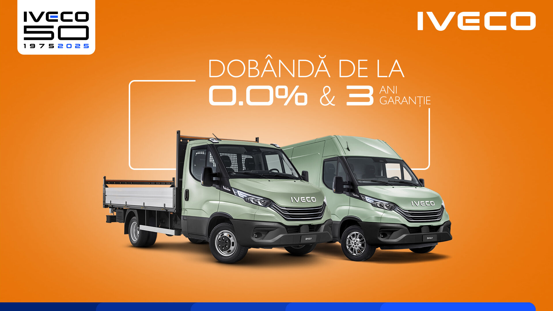 Ofertă valabilă până la 31/12/2025 la dealerii IVECO din România şi structurată după cum urmează: Leasing cu avans 10% pentru orice vehicul din gama DAILY cu dobândă de: