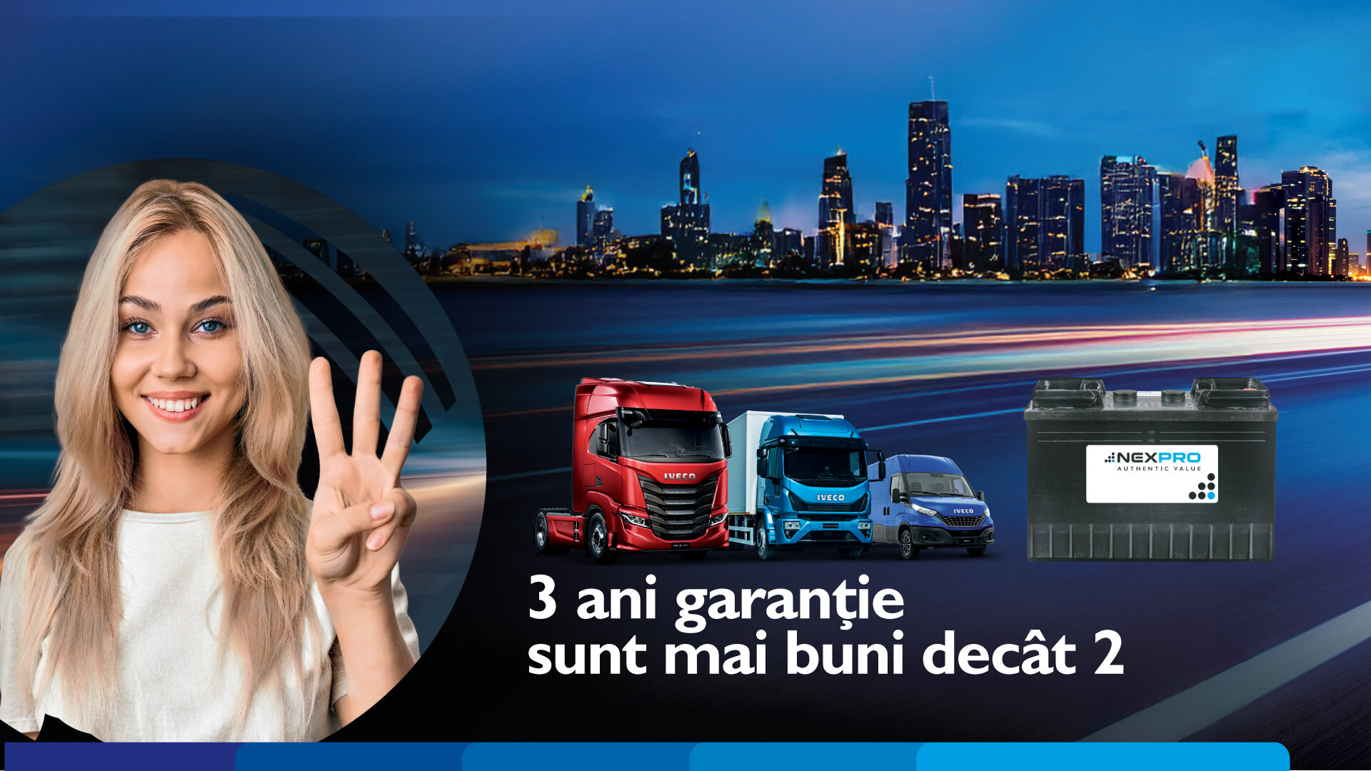 - Promoție: 36 de luni (3 ani) pentru orice baterie NEXPRO achiziționată din rețeaua de distribuitori autorizați IVECO România.
